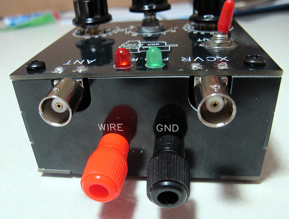 ( ) Assemble the binding posts: remove the nuts, washers and solder lug, then insert the threaded bolt into the holes. Refer to this picture. Reassemble the hardware on the inside of the case with one of the nuts against the enclosure, and snug it up. Then assemble the solder tab, washer, and nut and snug it up also. J3, the red (antenna wire) post is insolated from ground by a gap in the copper around the hole, and is adjacent to the ANT BNC connector (J1). The black post doesnt need to have an extra wire to ground it, as it's grounded through the case, so install it without the lug.