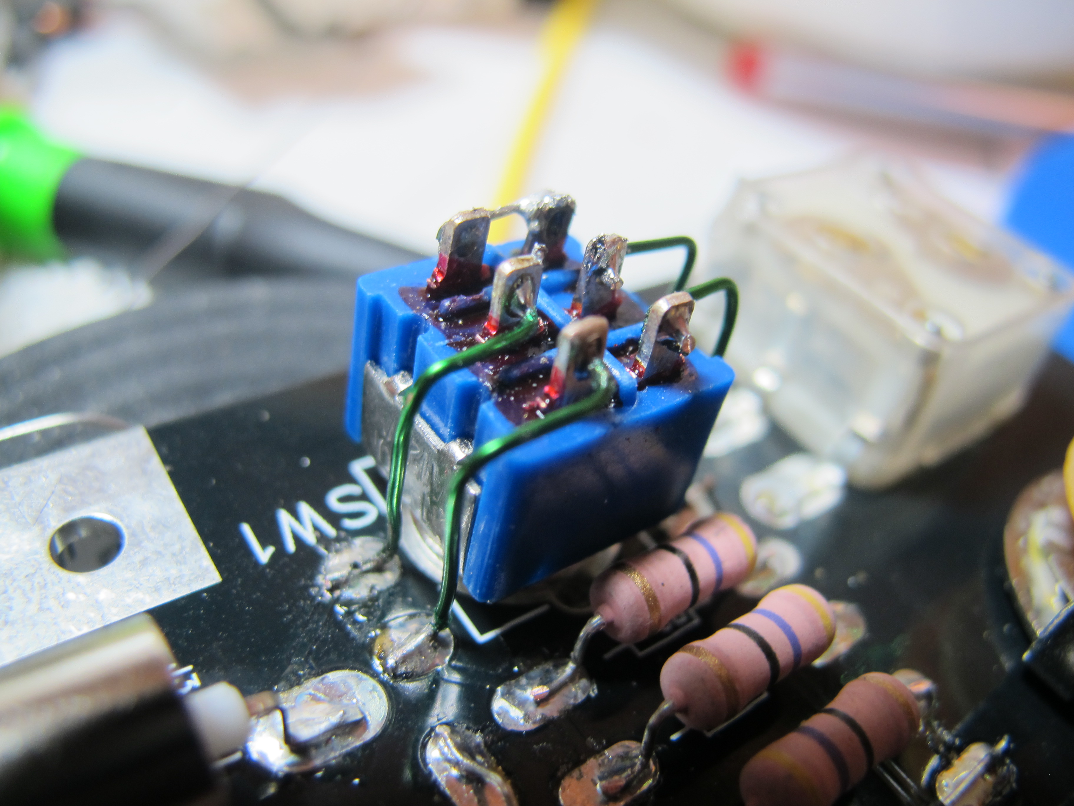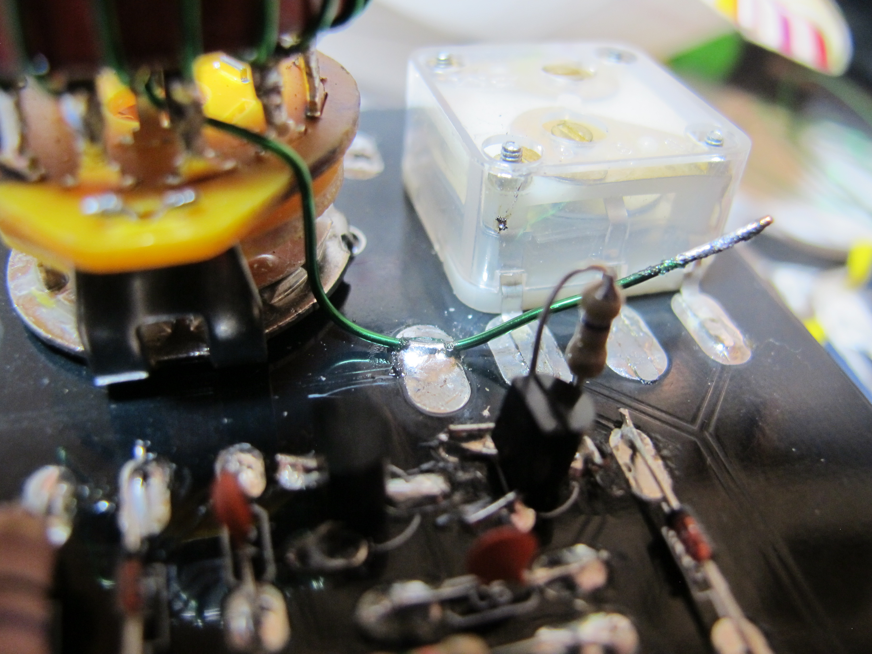 ( ) 1- R6 1.5M 1/4W mounted between R4 and R5. Solder it to the LH end of R4 and the RH end of R5. As in this picture.